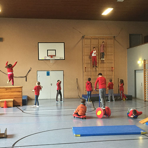 Zwei große Pausen mit Spielgeräten und Klettergerüst, Angebote für die Regenpause, Klassenraum als Bewegungsraum (Bewegungspausen, -spiele, -lieder), Sporttage, Spiel- und Sportfeste, Kooperation mit Sportvereinen, AGs